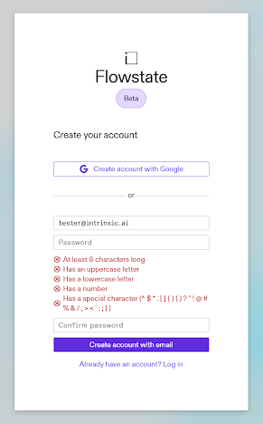 1. Set up your authentication credentials. There are two main options for signing in to Flowstate: (a) enter your email address and a password of your choice, or (b) authenticate with a Google account.