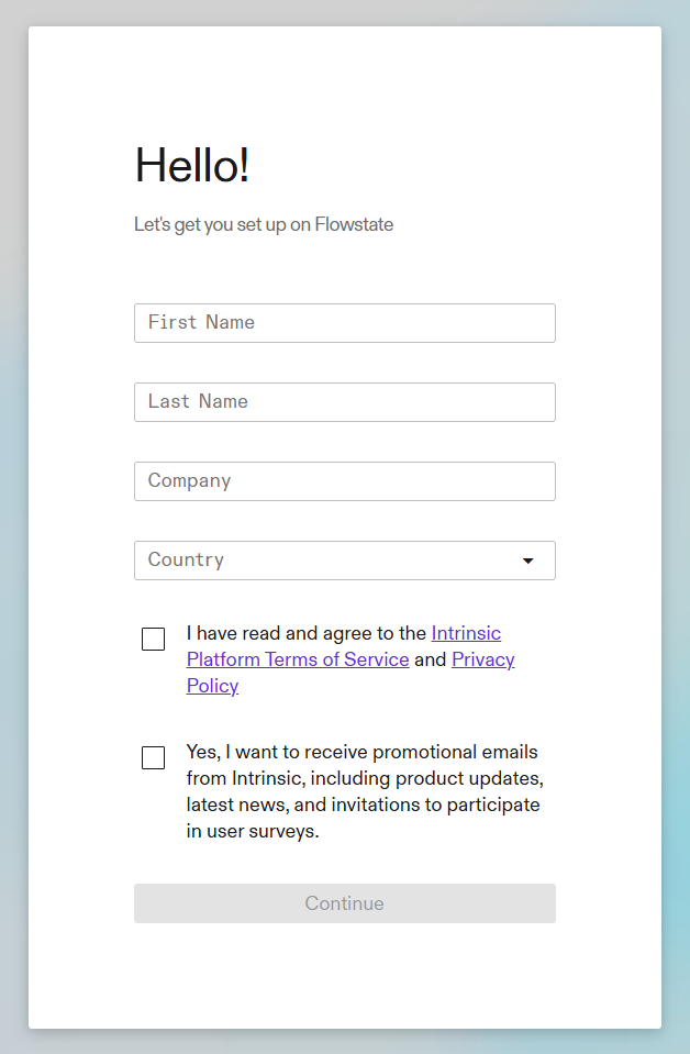 1. Set up your account. The following fields are required: full name, country, and agreeing to the Platform Terms of Service and Privacy policy. It is optional to join our marketing and survey email lists; however, we recommend joining to stay up-to-date on the latest Flowstate features, capabilities, and events.