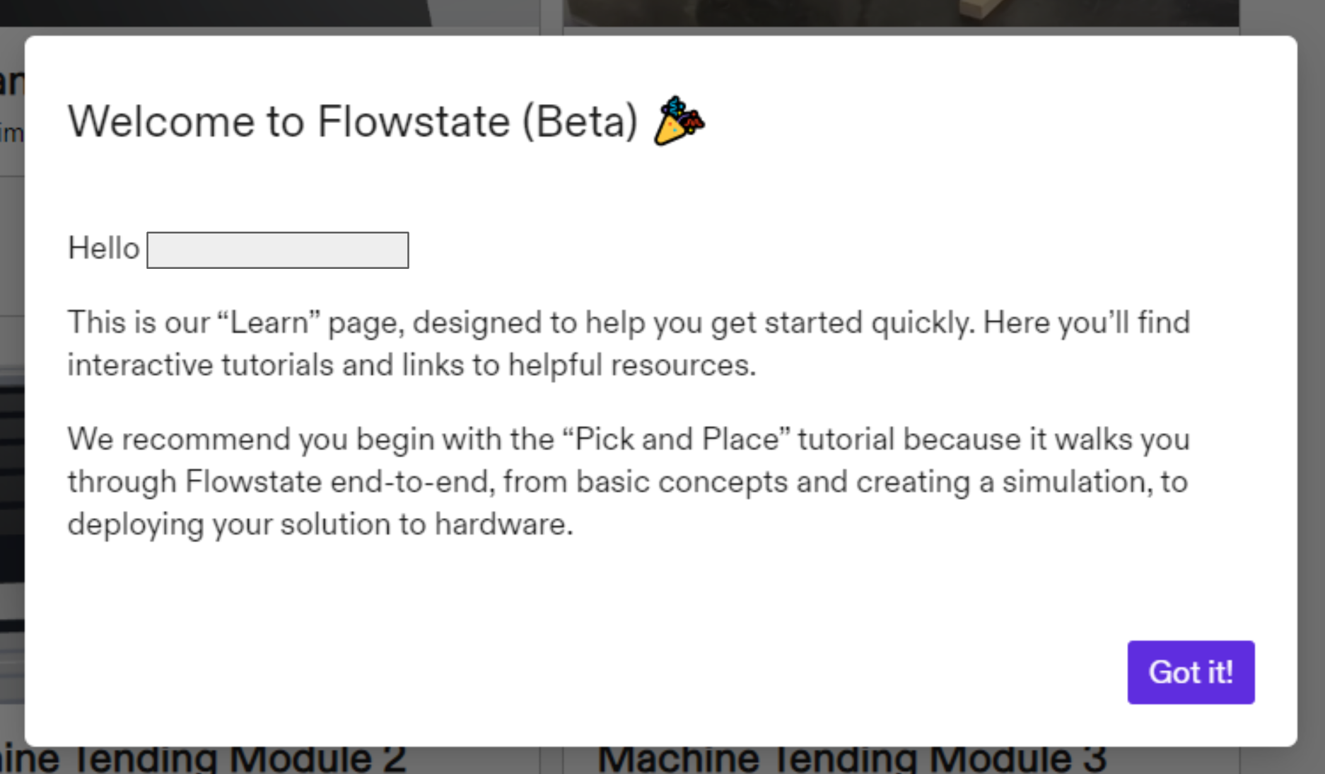1. We welcome you with a brief explanation of the Learn page and our recommendation for getting started. Click Got it!