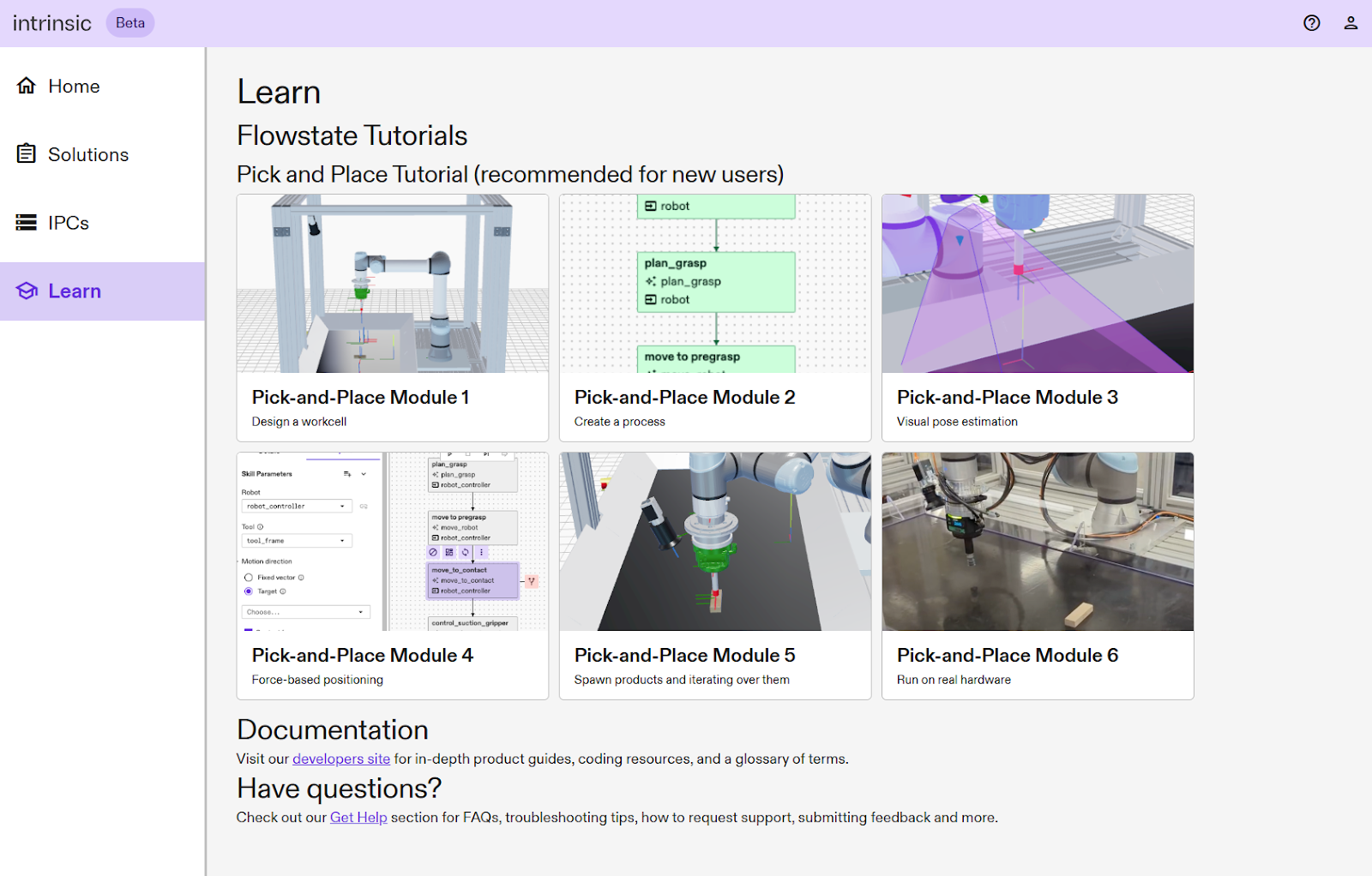 1. You’ll be dropped off on the Learn page, which highlights tutorials from our developer documentation site. We recommend you start with Pick and Place Module 1. When clicked, the tutorial will open in a new browser tab. The Learn page is always accessible from the left (navigation) panel.