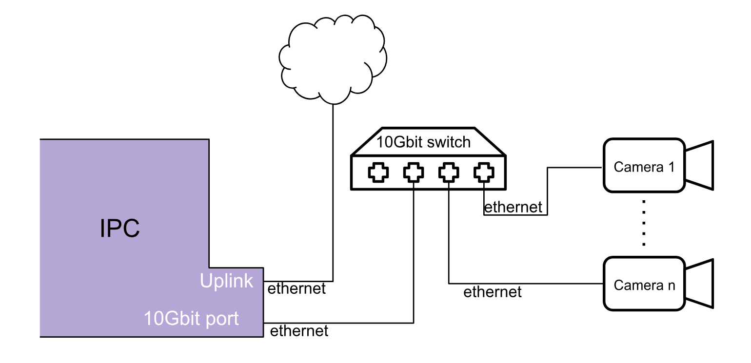 This is for the cases that need more bandwidth. For example when dealing with high-resolution cameras, high frame rates and when you want to do multi-camera pose estimation. In this case we recommend using a separate port on your IPC with a 10 Gbit/s network controller. Combine this with a 2.5 Gbit/s or 10 Gbit/s PoE switch which has at least a 10 Gbit/s uplink to the IPC. The wiring then looks like this: