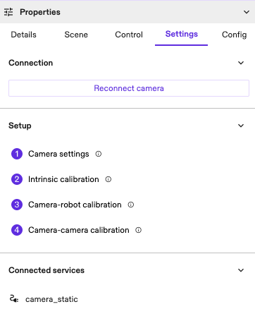 1. To establish a connection between your physical camera and the corresponding digital twin camera, go the Settings tab in the Properties panel of your camera.