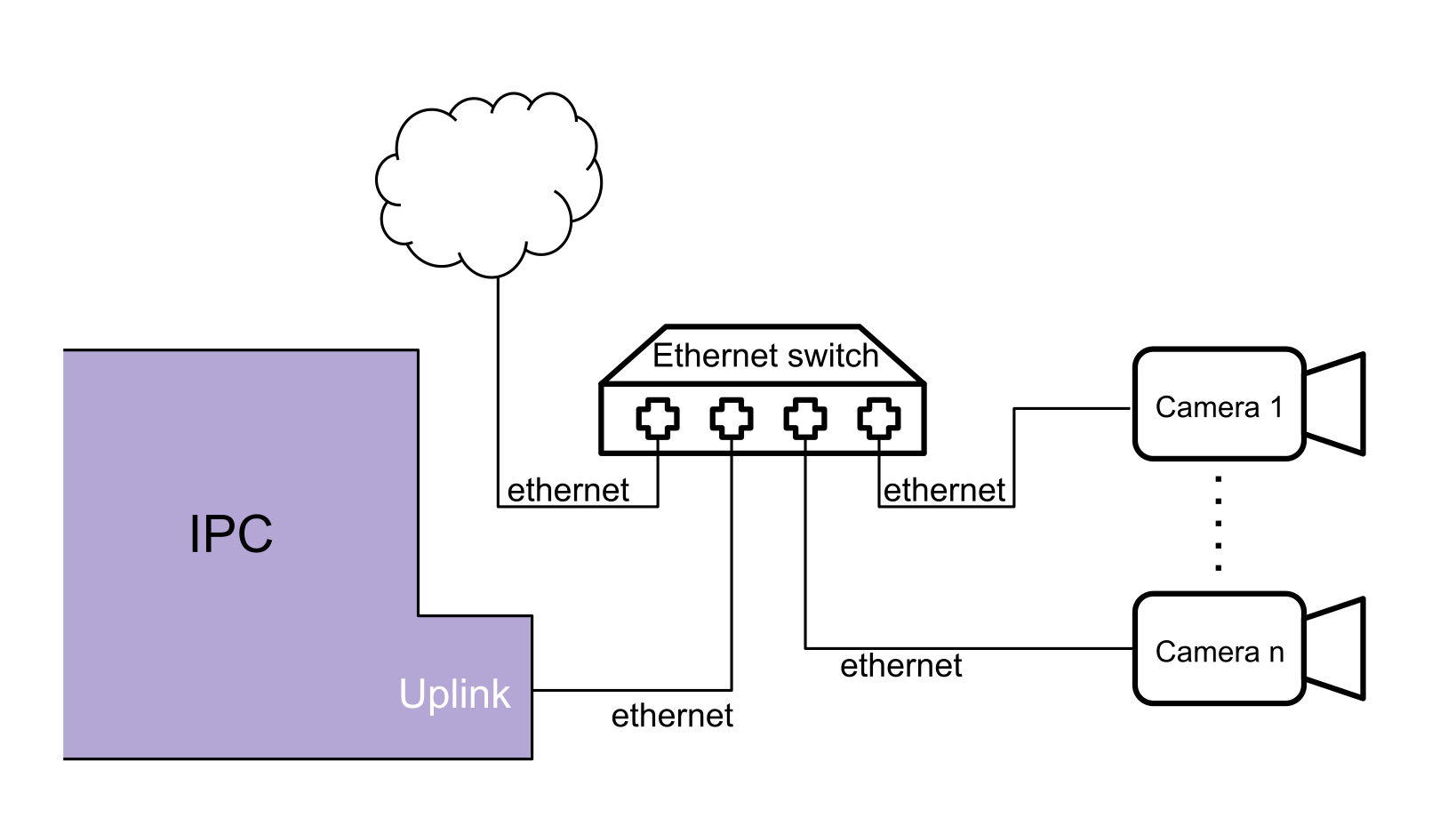 If you are dealing with cameras of 2 megapixel resolution and don't want to access multiple cameras at once, the simple wiring is sufficient. You will need to ensure that the cameras are set up to get an IP address via DHCP. Connect the IPC uplink and camera to an Ethernet switch. If the camera supports Power over Ethernet (PoE), consider using a PoE switch to power it and reduce cabling. Otherwise, supply power to the camera according to the instruction manual.